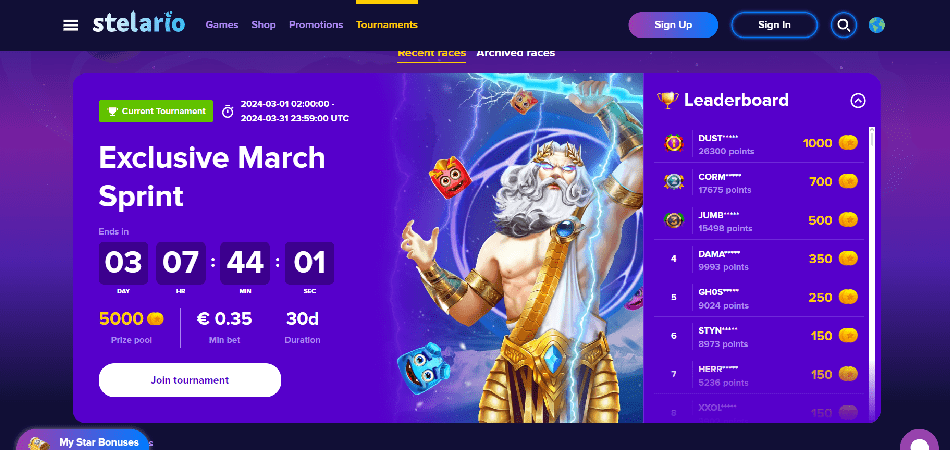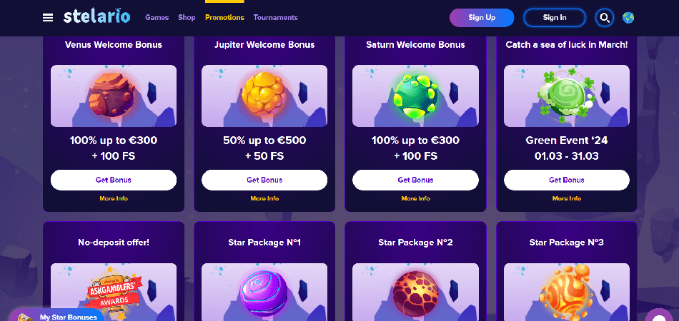 Die Entwickler von Dozen Spins Casino, Altaprime, haben ein neues Online-Casino namens Stelario gestartet. Es stehen Spielautomaten, Tischspiele und sogar Live-Dealer zur Verfügung. Der Shop, der Münzen akzeptiert, die Sie beim Spielen verdienen, ist ein weiteres tolles Feature, das Sie hier finden. Dort können Sie Ihre Münzen gegen Bargeld eintauschen oder Freispiele an bestimmten Spielautomaten erwerben.