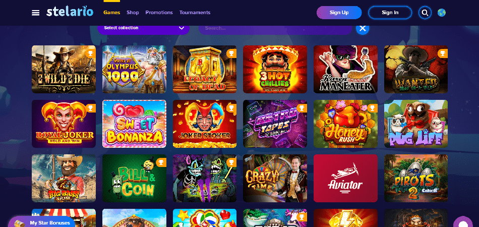 Stelario Casino verfügt über eine umfangreiche Bibliothek mit über 3.000 Spielen, darunter Spielautomaten, Tischspiele und Live-Dealer-Optionen. Die Sammlung ist vielfältig und umfasst Themen von der griechischen und ägyptischen Mythologie bis zur nordischen Mythologie und darüber hinaus. Diese Spiele stammen von mehr als 30 verschiedenen Anbietern, darunter renommierte Namen wie Play'n GO, Big Time Gaming, Yggdrasil, NetEnt, Red Tiger, Evolution Gaming und Microgaming.