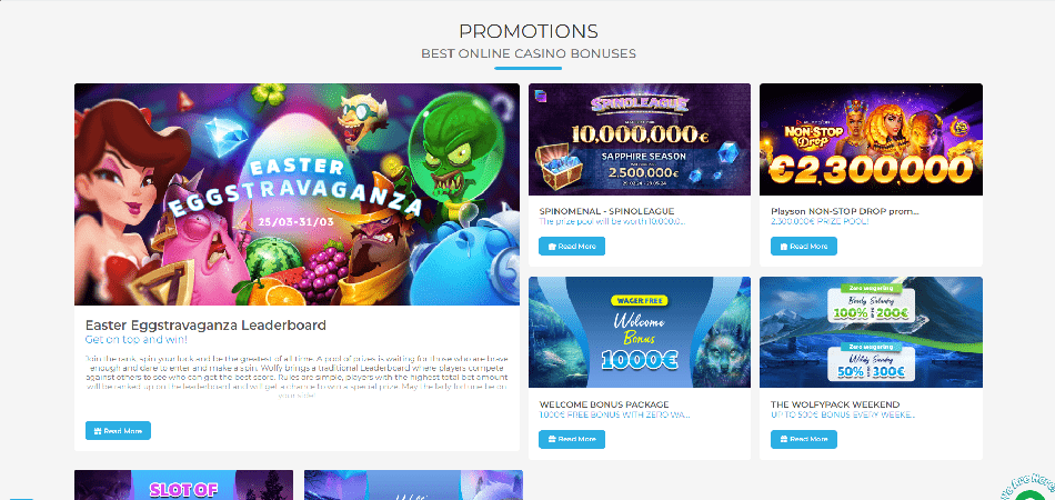 Wolfy versucht, mit seinen Bonusangeboten hervorzustechen und den Spielern eine Pause von den sich wiederholenden Willkommensboni mit 65-fachen Wettanforderungen zu verschaffen. Bevor Sie jedoch ein Konto eröffnen, lesen Sie den Zahlungsabschnitt, um einen reibungslosen Auszahlungsprozess zu gewährleisten. Wolfy Casino bietet Spiele von großen und kleinen Spieleanbietern für jeden Geschmack und jedes Budget.
