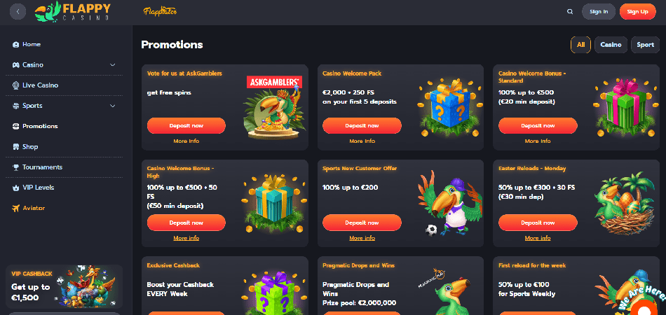 Flappy Casino aims to cater to the diverse needs of gamblers by offering a wide range of gaming options, including both casino games and sports betting. While the focus is primarily on the casino experience, players can also enjoy sports betting on the platform. With a gaming license from Curacao and transparent terms, Flappy Casino provides a secure and promising online gambling environment for players interested in both casinos and sports.