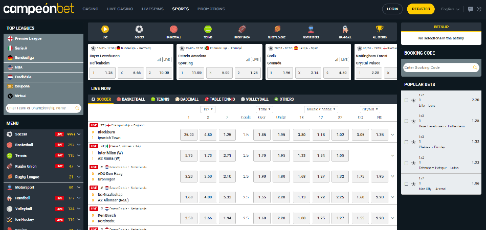 Det er mer enn 35 forskjellige idretter tilgjengelig i Campeonbet.coms pre-match segment, inkludert pesapallo, vannpolo, basketball og fotball, med en total utbetaling på 94%. Når du satser på fotball, er sjansene for WDW høye i de store ligaene, men betydelig lavere når du bruker tilleggsalternativer som Asian Handicaps og Over/Under. Kort, hjørner og spillerspesialer er bare noen av de hundrevis av markedene som er tilgjengelige for spillere.