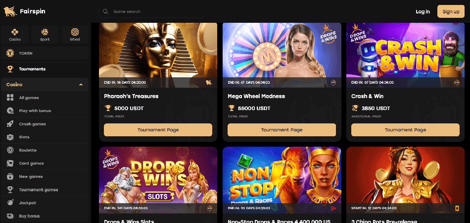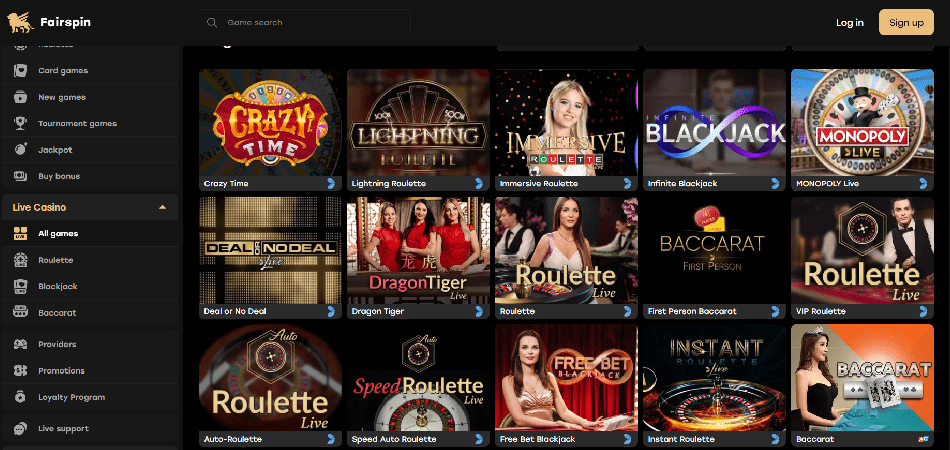 FairSpin har et mangfoldig utvalg av spill, inkludert populære spilleautomater som Golden Digger og Hustling, samt forskjellige kort- og bordspill som Blackjack, Baccarat og Poker. I tillegg kan spillere satse på live-show som Dream Catcher og Mega Ball.